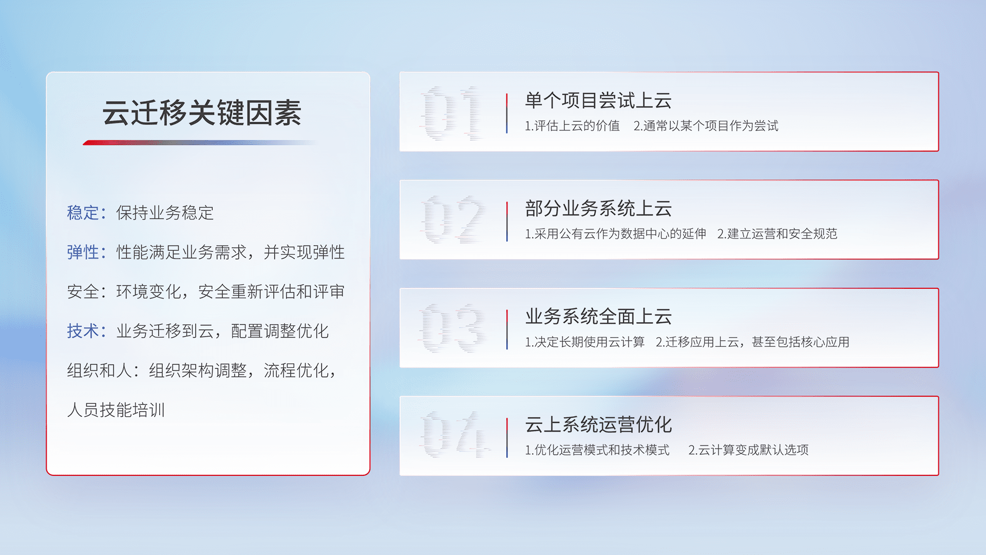 结合实际业务,,,从规划设计、、云平台选型、、、云原生改造、、、数据迁移、、、集成交付,,,迁移全过程为客户识别最佳上云路径,,,,做好风险识别管理,,,设计网络架构、、身份权限、、、、安全审计合规、、、操作审计、、、日志审计、、监控告警策略、、、多站点容灾设计等,,,对云上基础设施进行整体规划,,,提升IT治理水平,,以满足弹性、、、、高可用、、、、高性能的需求。。。。