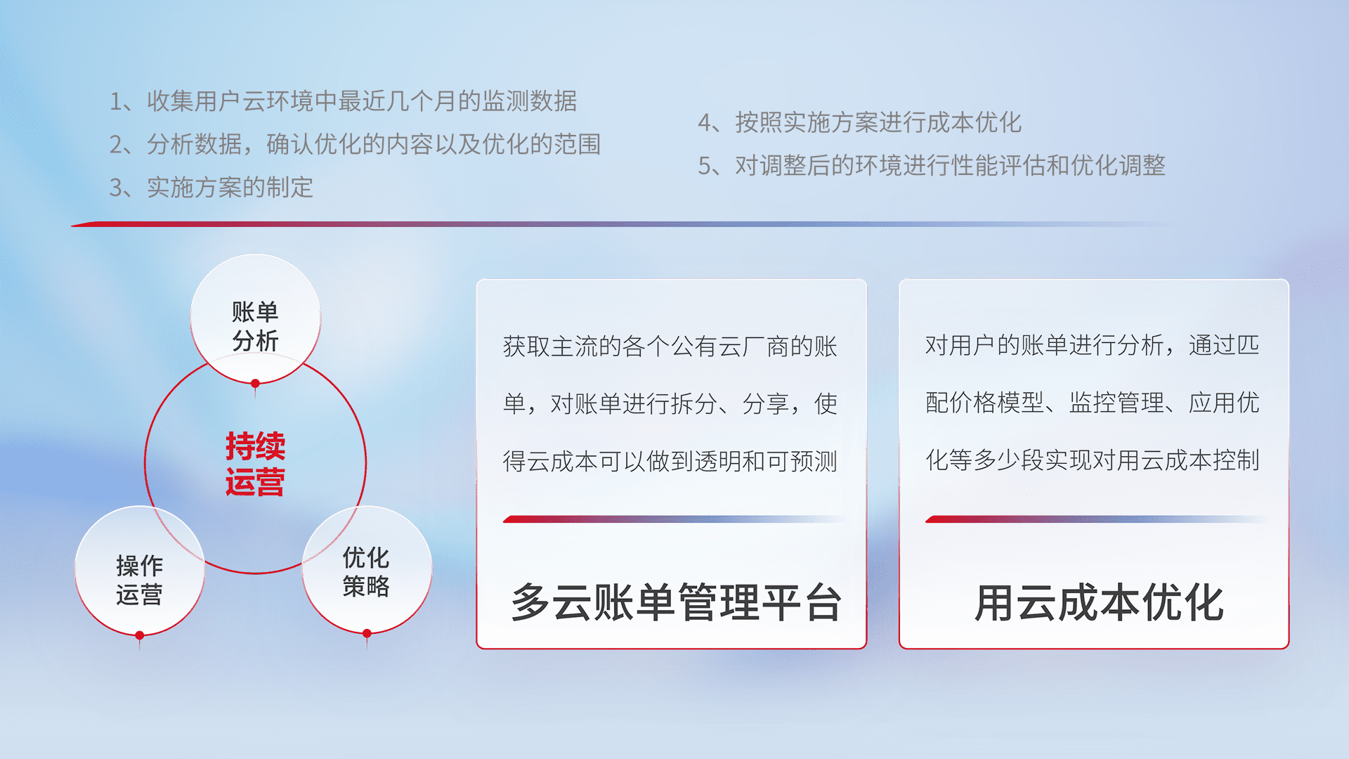 通过多云纳管,,,以统一的资源数据模型把客户的云资源进行抽象和封装,,,,进而实现对多云资源的统一操作,,,保障云资源管理的可靠性、、稳定性与可用性。。。量身定制化运维内容,,,配置、、、开发运维、、补丁管理、、、、备份、、、监控、、、、认证和访问管理、、、、审计和日常巡检等,,,保障在用云过程中的可靠度,,,,稳定度以及高可用率。。。。